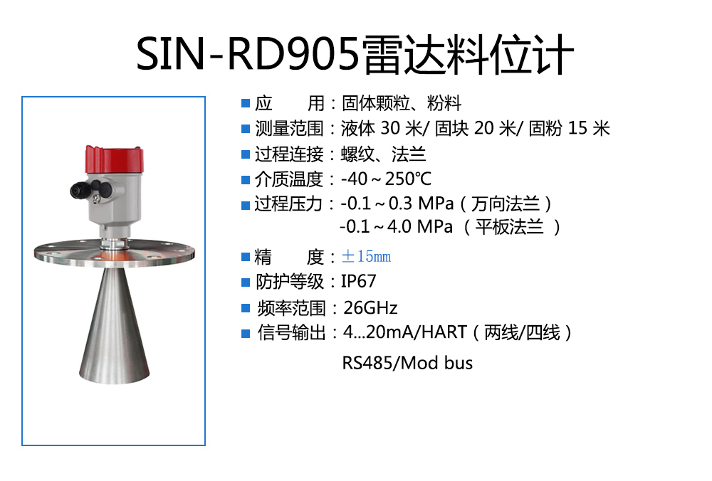當(dāng)前位置:首頁(yè) > 雷達(dá)液位計(jì) > SIN-RD905雷達(dá)料位計(jì)_適用于固體顆粒、粉料_